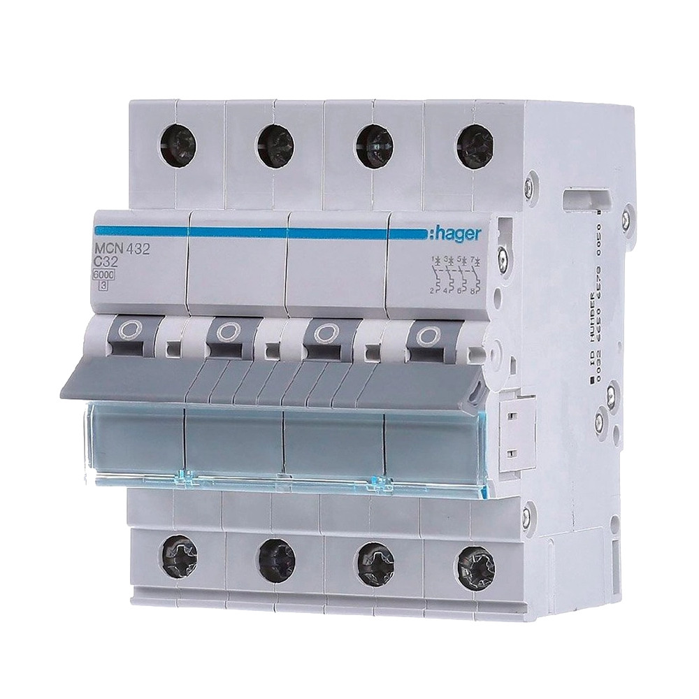 Автоматичний вимикач Hager MCN432A 4P 6 кА C-32A 4M встановлюється в електричних щитах на стандартну напрямну DIN-рейку і може використовуватися як для побутових, так і для промислових цілей. Він швидко реагує на перевантаження і короткі замикання, автоматично вимикаючи електричний ланцюг для запобігання загоряння і пошкодження обладнання. Він також може працювати як вимикач для ланцюгів навантаження.